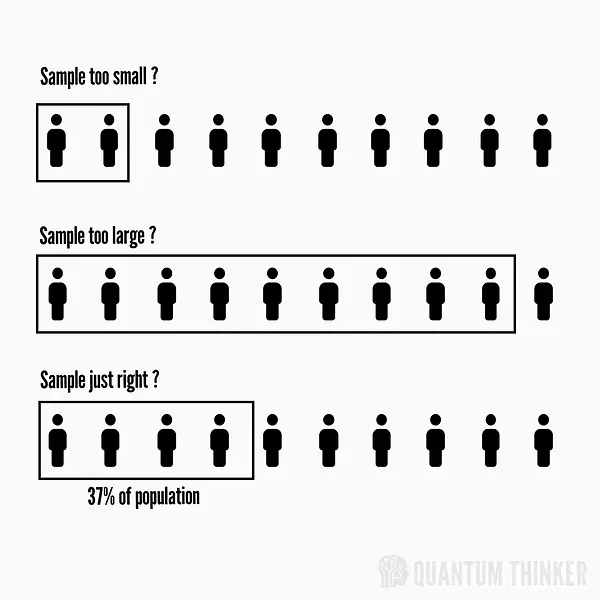 "37%法则"的意思就是,寻找阶段进行到37%就要停止。 100个应聘者,先面试前37个,此后的面试只要遇到一个更优秀的,就立刻录取,不再继续面试了。换句话说,前37个面试者无论多么优秀,都不会录取,他们只是用来确定录取的标准。