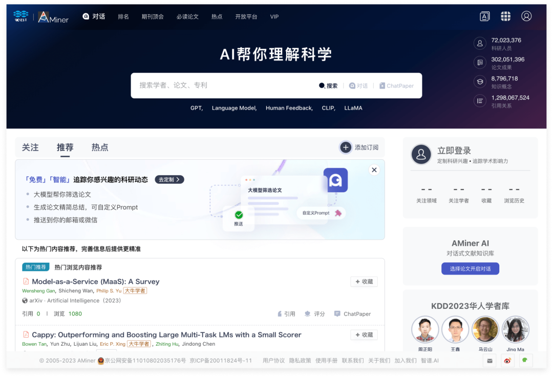 AMiner由清华大学计算机科学与技术系建立,收录了超过 3.2 亿学术论文/专利和 1.33 亿学者的科技图谱,提供学术检索、论文检索等功能。内置 AI 功能可以帮你筛选感兴趣的论文生成总结。
