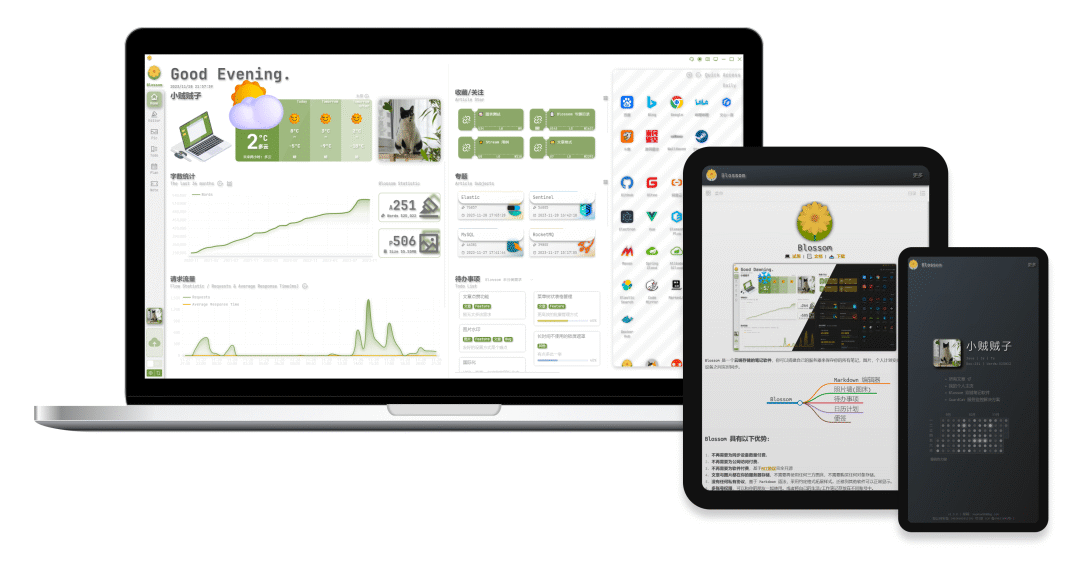 Blossom 是一个支持私有部署的云端双链笔记软件,你可以将你的笔记,图片,个人计划安排保存在自己的服务器中,并在任意设备之间实时同步。同时还是一个动态博客。支持 Windows,Mac,网页客户端,网页移动端。