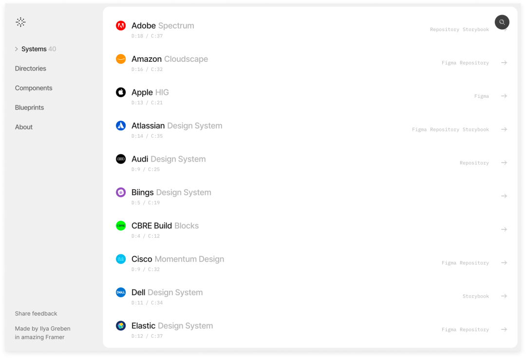 收集了 40 个设计系统,可以按结构组成、组件等维度查看不同的设计系统对应的内容。